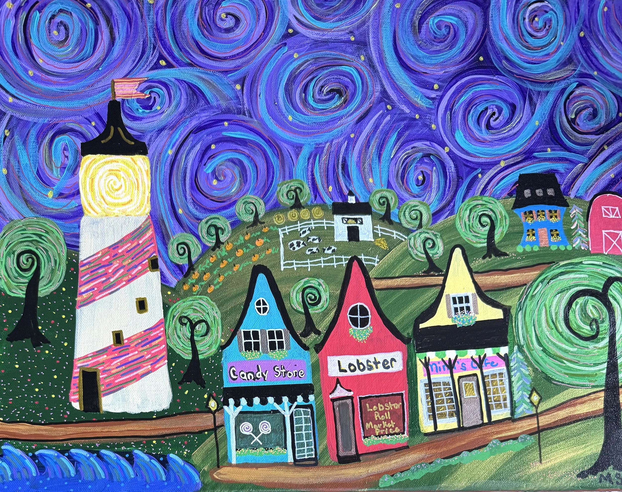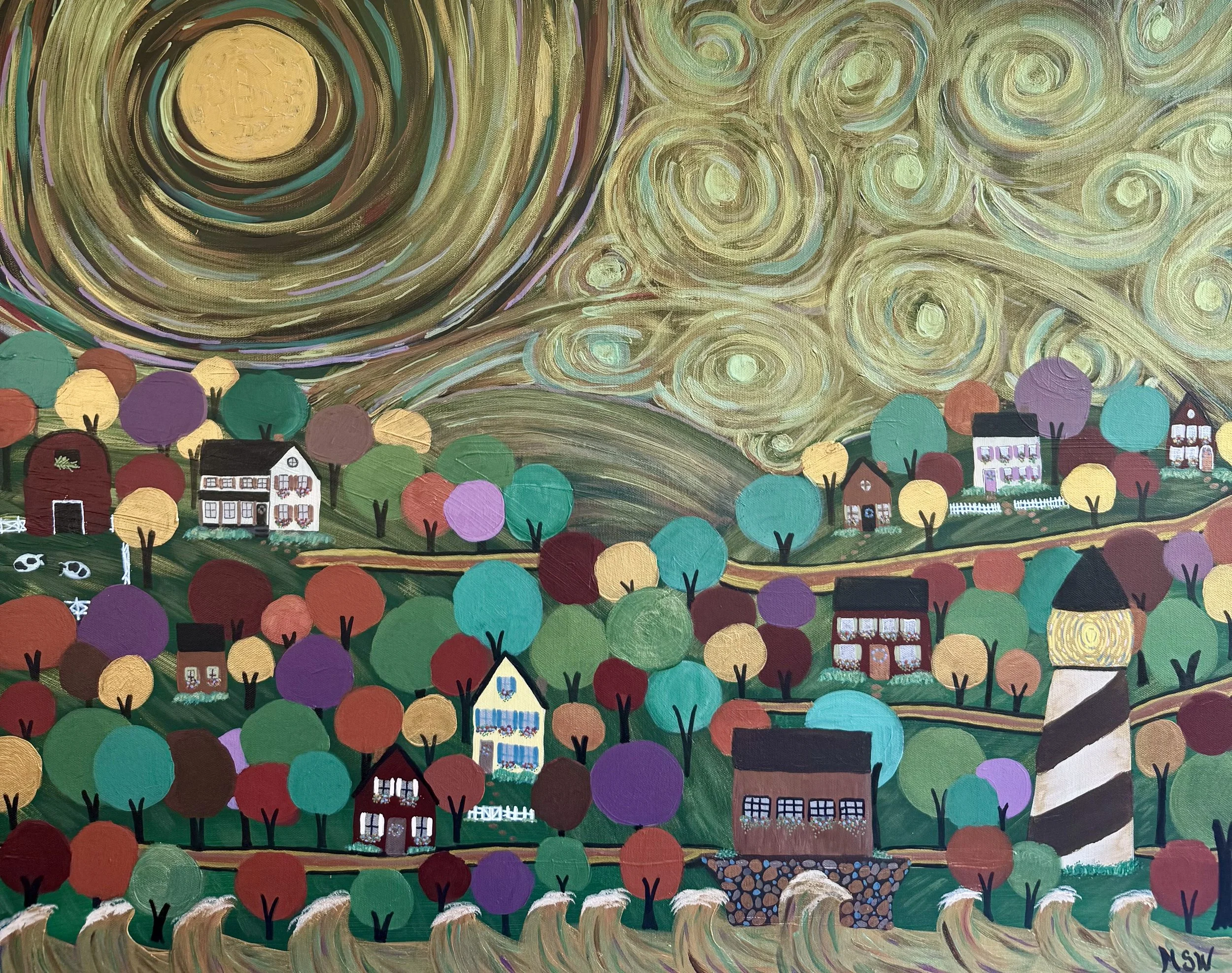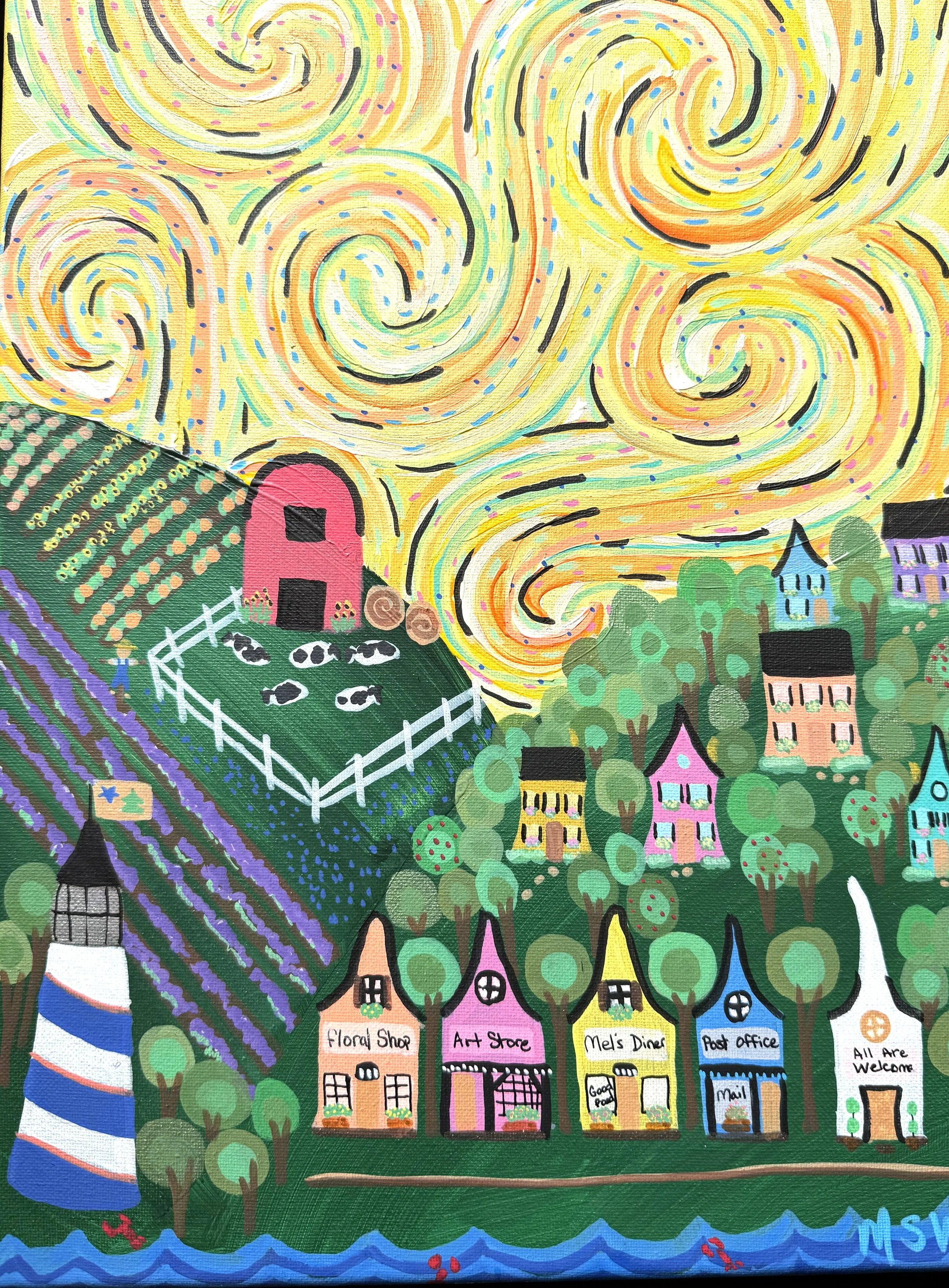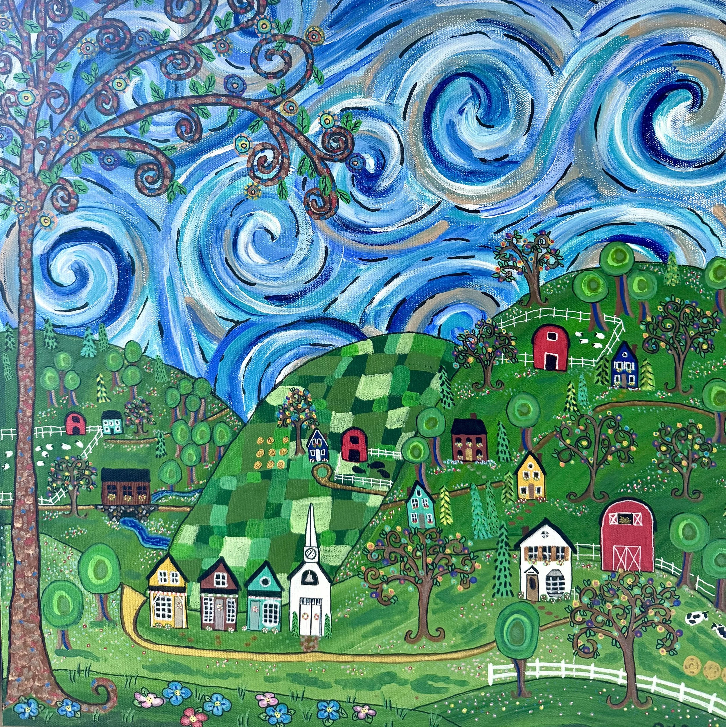 Just a few months later, and I had paintings hanging in nine states and one in Canada and a budding career that exploded before I could even catch my breath. My work is rooted in nostalgia yet infused with imagination and meditation, becoming one with every picture and allowing the universe to flow through me and into every piece. I blend the warmth of American folk art with the swirling energy of Van Gogh-inspired skies, creating whimsical towns where the universe itself is alive. Each piece is a celebration of community, color, and wonder, where the ordinary becomes magical, and all while gifting the viewer an escape from today’s chaotic world.