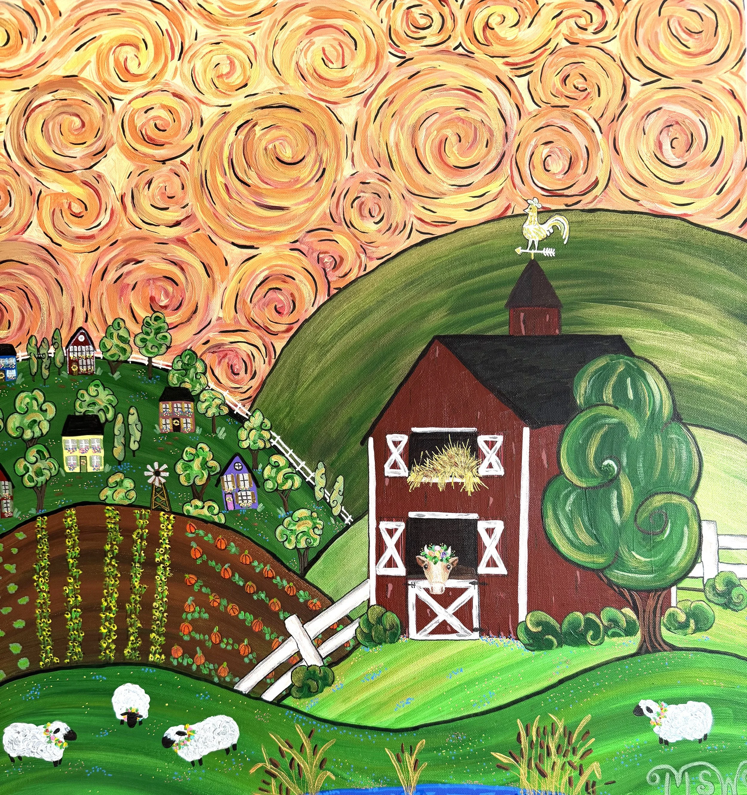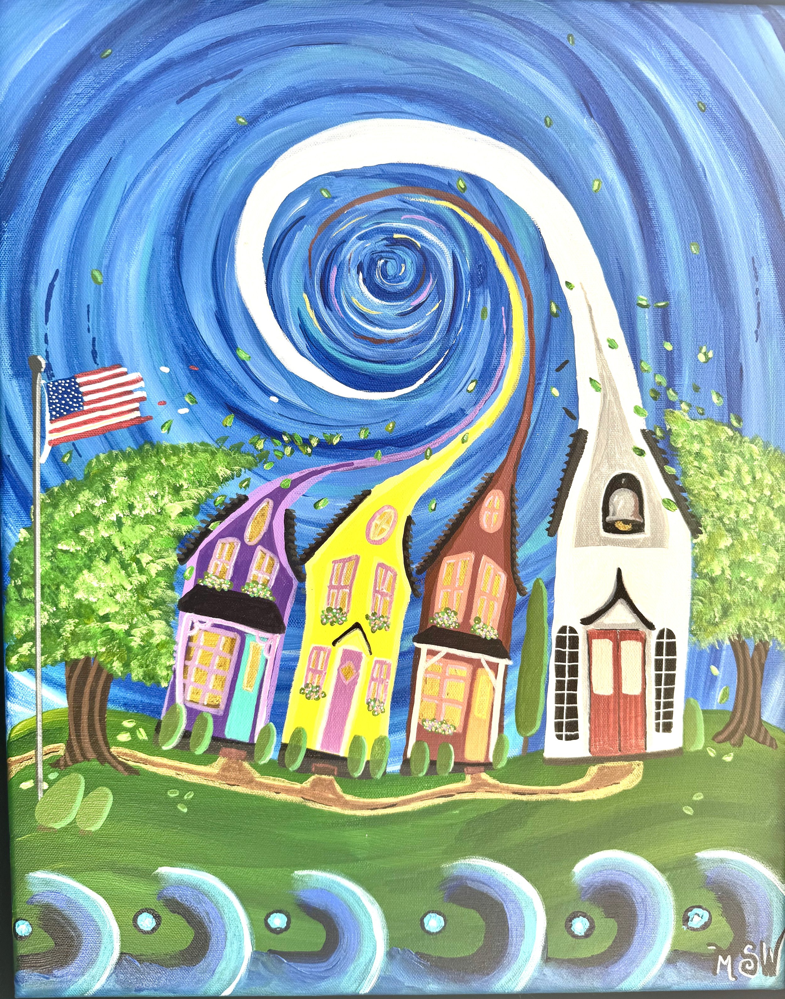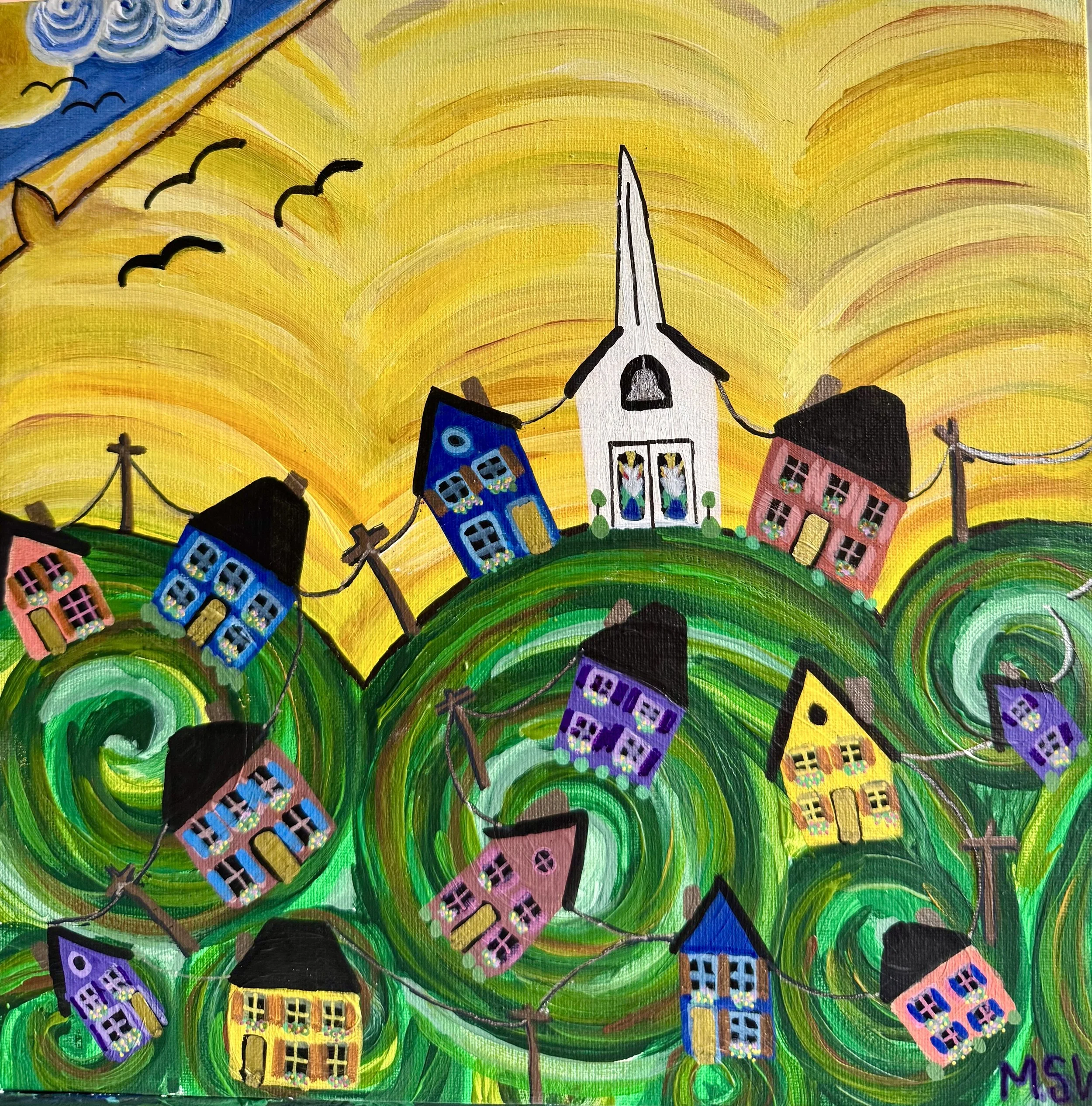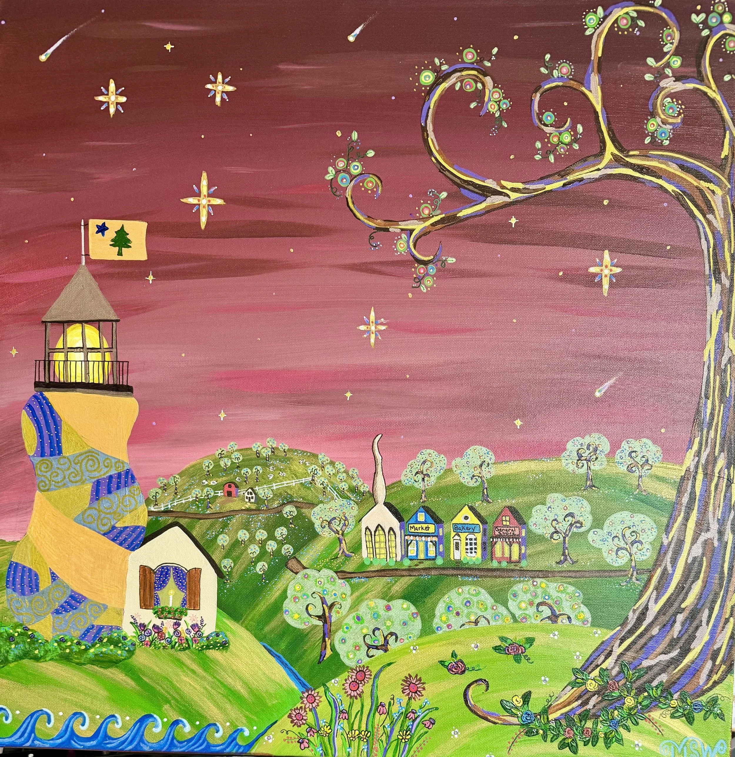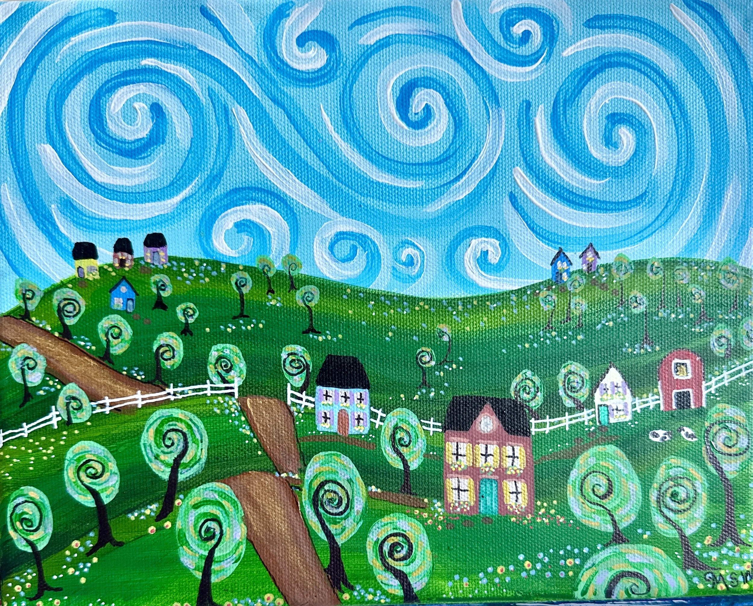 Just a few months later, and I had paintings hanging in nine states and one in Canada and a budding career that exploded before I could even catch my breath. My work is rooted in nostalgia yet infused with imagination and meditation, becoming one with every picture and allowing the universe to flow through me and into every piece. I blend the warmth of American folk art with the swirling energy of Van Gogh-inspired skies, creating whimsical towns where the universe itself is alive. Each piece is a celebration of community, color, and wonder, where the ordinary becomes magical, and all while gifting the viewer an escape from today’s chaotic world.